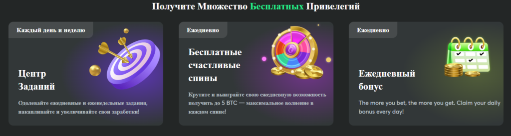 - Күнделікті промо және Lucky Spin – тегін спин арқылы крипто (1 BTC дейін) ұту мүмкіндігі, random coin drops немесе task-based сыйлықтар.